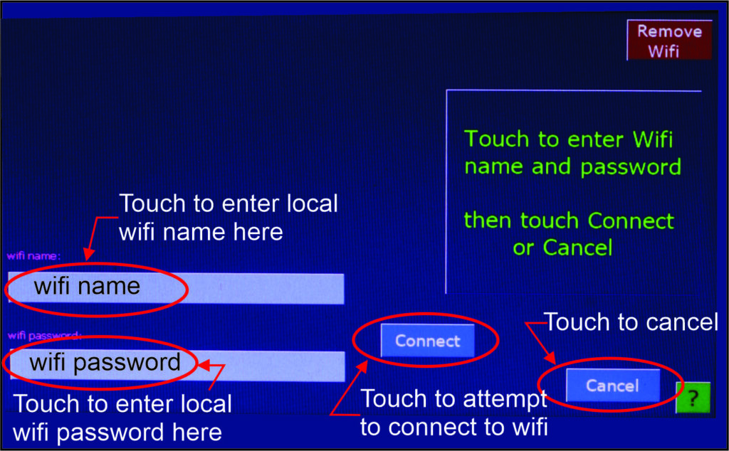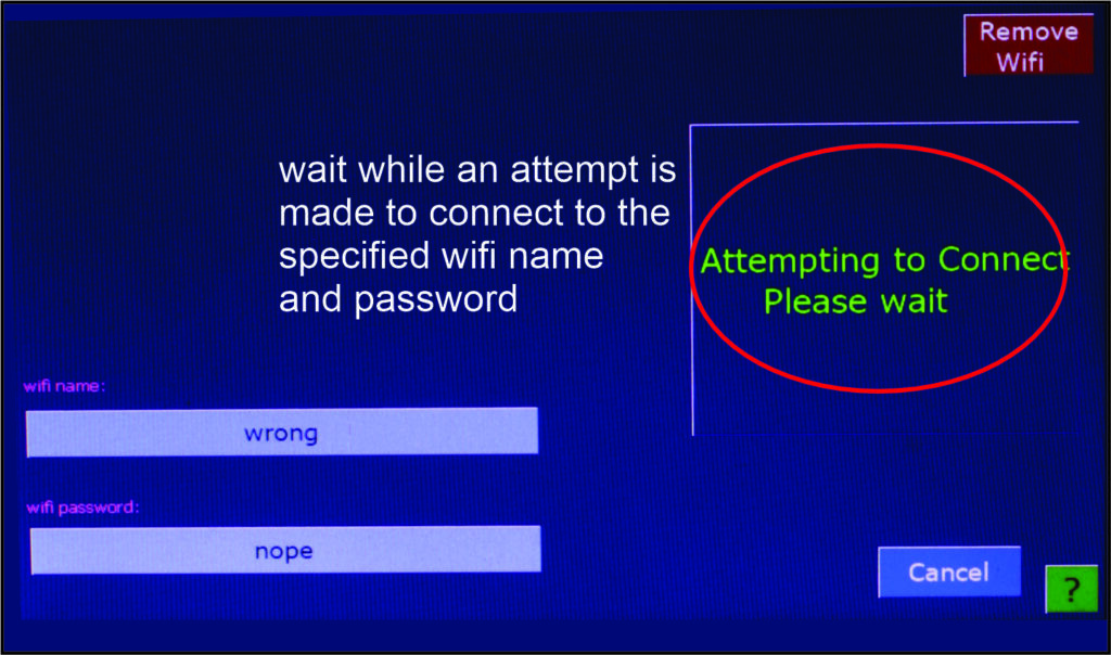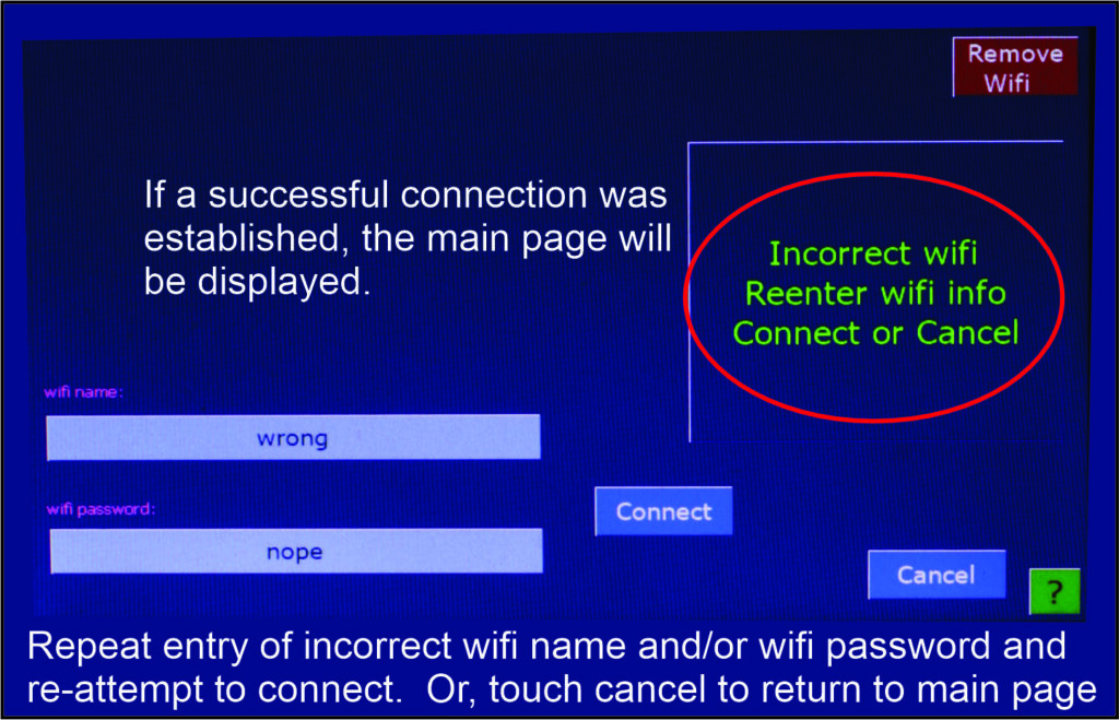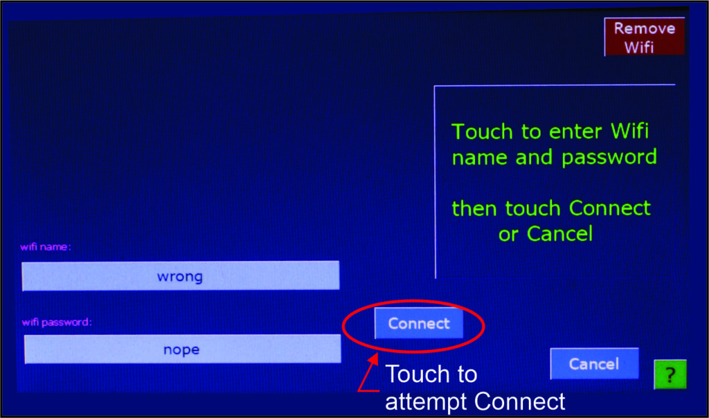 An administrator can alert Geo as to the desired wifi network. Enter wifi name and password then Connect. If connection is successful, you will be returned to home screen. If unsuccessful, you may try again or return to home screen unconnected. You can save palettes without being connected.